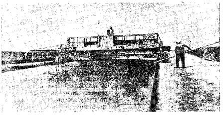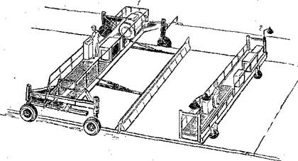 Рис. 39 Выглаживание поверхности бетонного покрытия бетоноотделочной машиной ДС-104 На рис. 39 показана технологическая операция по выглаживанию поверхности бетонного покрытии и нанесению бороздок, создающих шероховатость. Техническая характеристика бетоноотделочной машины Ширина обрабатываемой полосы, м...... 7.92 Мощность силовой установки, л с............ 47 Рабочие органы: диагональная выглаживающая труба..... 2 длина трубы, м.......................................... 6,06 диаметр трубы, м....................................... 0,243 Тип шин........................................................ 12X16,5 Скорость передвижения (вперед и назад), м/мин.. 0—71,3 количество.............................................. 2 объем одного бака, л.............................. 512