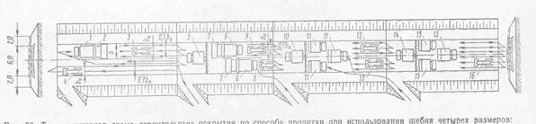 Для розлива вяжущего по новому участку нужно предварительно набрать заданную скорость автогудронатора, заранее отрегулировав подачу вяжущего. Сопла распределительной трубки открывают при прохождении закрытого места, чтобы избежать случайного пропуска. При применении каменноугольного дегтя или эмульсии, обладающих меньшей вязкостью, для предотвращения их стекания в нижнюю часть обрабатываемого слоя целесообразно после уплотнения первой россыпи из крупного щебня распределить часть щебня размером 10—20 мм из расчета 0,4—0,5 м3 на 100 м2 покрытия. Более мелкий щебень нужно распределять немедленно после розлива вяжущего. В случае применения эмульсии россыпь осуществляют после распада эмульсии и образования черной пленки вяжущего на поверхности щебня предыдущей россыпи. Лучшее заполнение мелким щебнем и каменной мелочью промежутков между крупным щебнем обеспечивают разметанием жесткими метлами. Мелкий щебень и каменная мелочь, не образуя самостоятельного слоя, должны заполнить пустоты. Технологическая схема постройки покрытия по способу пропитки при использовании щебня четырех размеров состоит из ряда последовательно выполняемых операций (рис. 80). Работы должны быть организованы таким образом, чтобы не происходило загрязнение щебня первой россыпи, так как оно может существенно ухудшить сцепление щебня с вяжущим. Чтобы соблюсти указанное требование, в течение одних суток (не более, чем в течение двух смен) должен быть выполнен цикл, включающий первое распределение щебня, его уплотнение, розлив вяжущего, следующую россыпь щебня меньшего размера и его уплотнение. Последовательность укладки материалов приведена на рис. 81. Для обеспечения большей водонепроницаемости, морозо- и износостойкости по готовому покрытию укладывают слой износа, типа поверхностной обработки. Осенью поверхностную обработку назначают с учетом состояния покрытия и погодных условий. Летом для лучшего формирования покрытия до устройства поверхностной обработки можно открыть движение в течение 10—15 дней. При способе пропитки с применением щебня четырех размеров слой износа может быть сделан на следующий год. Объясняется это большей плотностью и водонепроницаемостью такого покрытия.