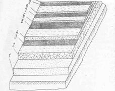 Рис. 81. Схема расположения слоев.в дорожной одежде, построенной по способу пропитки: 1 — песчаный дополнительный слой основания; г — щебеночное основание; 3 — подгрунтовка; 4 — основной слой для пропитки (6—8 см) щебня размером 40—70 мм; 5 — первый розлив вяжущего; 6 — россыпь мелкого щебня размером 20—40 мм; 7 — второй розлив вяжущего; 8 — россыпь каменной мелочи размером 10—20 мм; 9 — третий розлив вяжущего; 10 — россыпь каменной мелочи размером 5—10 мм По окончании работ в течение 20—25 дней нужно вести наблюдение за формированием покрытия, осуществляя: регулирование движения для равномерного дополнительного уплотнения и формирования слоя; дополнительную подкатку покрытия в течение первых 10 дней, что способствует более равномерному распределению материала в слое износа и созданию ровной поверхности; систематическое наметание мелочи, разбрасываемой колесами автомобилей, для ее втапливания в поверхность покрытия колесами транспортных средств; досыпку мелочи на участках, где выступает излишний вяжущий материал. Отслаивающийся материал на поверхности покрытия (если распределено вяжущее по загрязненному или влажному слою) необходимо вырубить и удалить, освободившуюся поверхность очистить, просушить и восстановить удаленный слой. Образование на покрытии после выпадения дождя темных пятен или полос обычно вызвано недостатком вяжущего. В таких местах после просыхания удаляют щебень, не связанный с покрытием, разливают вяжущее в количестве 0,8—1 л/м2, рассыпают щебень 5—10 мм и уплотняют трамбовками или катками. Замедленное формирование покрытия может происходить во влажную прохладную погоду. При этом после наметания и разравнивания материала последней россыпи и ее дополнительного уплотнения катками следует разлить жидкий битум или деготь марок СГ 130/200, МГ 130/200, С-6 или Д-4 в количестве 0,6—1 л/м2 с дополнительным распределением высевок (размер менее 5 мм) в количестве 0,5—0,8 м3 на 100 м2. Можно применять быстрораспадающуюся эмульсию с содержанием 55—65% битума в количестве 0,5—0,7 л/м2 из расчета на битум. Эмульсию распределяют в два приема равными частями, после этого рассыпают высевки. Контроль качества включает испытание материалов: битумов по ГОСТ 11501—78, ГОСТ 11512—65, ГОСТ 11505—75; каменноугольных дегтей — по ГОСТ 4641—74; щебня ГОСТ 8268—74. Оценку ровности покрытия или основания следует производить многоопорной рейкой, но можно применить и трехметровую рейку, располагая ее параллельно оси покрытия. По существующим требованиям просвет под трехметровой рейкой не должен быть более 7 мм для покрытия и не более 10 мм для основания. Учитывая большое значение ровности для автомобилей, в целях лучшего управления качеством работ целесообразно ввести дифференцированные требования к ровности покрытий и оснований, принимаемых с оценками «отлично», «хорошо» и «удовлетворительно». Поскольку показатели ровности являются случайными величинами, меняющимися в достаточно широких пределах, следует рекомендовать допустимые проценты различных показателей ровности вплоть до максимально допустимого. Отклонение ширины покрытия от проектной не должно быть более 5 см, допустимое отклонение поперечного уклона ±5 °/оо.