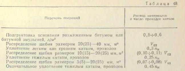 и БНД 40/60, для теплого —битумы БНД 200/300 и БН 200/300, БНД 130/200 и БН 130/200, СП30/200, МПЗО/200, дегти Д-6, ДС-7; для холодного —битумы СГ70/130, МГ70/130, дегти Д-5, ДС-6. Более вязкие вяжущие обеспечивают лучшее сцепление зерен щебня, но их применение требует более высокой температуры при укладке. Поэтому такие вяжущие используют в горячем щебне. Холодный щебень укладывают при температуре окружающего воздуха, что требует применения менее вязкого вяжущего. Минеральные материалы, применяемые для обработки вяжущим, должны соответствовать требованиям табл. 41. Морозостойкость минерального материала должна быть та же, что и для материала, применяемого при постройке слоев по способу пропитки. Они также должны соответствовать требованиям ГОСТов. Точность дозирования составляющих смесь материалов по массе должна быть: для вяжущего +1,5%,щебня каждого размера d=3%. Дозируя влажный щебень, необходимо вносить поправку на влажность. Обработку щебня размером до 15 мм вяжущим следует производить в смесителях с лопастными мешалками, обеспечивающими более равномерное перемешивание и большую однородность смеси. Для обработки более крупного щебня можно применять смесители свободного перемешивания. Щебень должен быть нагрет до температуры, обеспечивающей хорошее обволакивание вяжущим. В случае применения ПАВ нагрев необработанного щебня для производства горячего щебня должен быть на 20° С ниже температуры, указанной в табл. 46, а для теплого и холодного — на 10° С. При сухой погоде и температуре воздуха выше +10° С, когда материал в процессе уплотнения остывает медленнее, целесообразно придерживаться нижних пределов, указанных в табл. 46. Перемешивание щебня с вяжущим при производстве горячего щебня обычно длится 3 мин, теплого и холодного — не менее 4 мин. ПЛВ снижают продолжительность перемешивания на 15—20%. Обволакивание щебня вяжущим должно быть равномерным без разрывов пленки, вяжущее не должно стекать со щебенок. Ориентировочный расход вяжущего указан в табл. 47. Мелкий щебень, обладая большой удельной поверхностью, требует повышенного расхода вяжущего. То же имеет место в случае применения осадочных пород, обладающих несколько повышенным поверхностным впитыванием вяжущего вследствие увеличенной пористости. Транспортировку горячего и теплого обработанного вяжущим щебня различных размеров осуществляют раздельно в автомобилях-самосвалах, кузов которых смазывают мыльным раствором, мазутом или нефтью, чтобы предотвратить налипание материала. Для минимального снижения температуры горячего и теплого щебня при перевозке дальше 20 км и в ветреную прохладную погоду (температура воздуха менее +10° С) кузов следует накрывать брезентом, щитами, матами, хорошо их закрепляя. Холодный щебень, обработанный вяжущим, можно перевозить автомобилями, а также железнодорожным и водным транспортом. Погрузку этого материала производят транспортерами, автопогрузчиками, экскаваторами. Во избежание слеживания в процессе перевозки на дальние расстояния температура холодного щебня должна быть не выше 30° С. При более высокой температуре (до 60° С) его можно перевозить только автомобилями-самосвалами.В этом случае дальность перевозки не должна превышать 50 км. Хранение холодного щебня, обработанного битумом класса МГ, осуществляют на открытых площадках с обеспеченным водоотвод