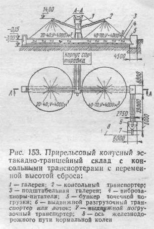 По способу хранения склады бывают открытые, закрытые и комбинированные, а по форме и типу сооружений — конусные, штабельные (прямолинейной и кольцевой формы), штабельно-полубункерные, бункерные и силосные. Основными типами складов, широко применяемых на КДЗ, являются открытые конусные, открытые штабельные, эстакадно-траншейные (рис. 153 и 154). При эксплуатации открытых конусных складов качество продукции ухудшается за счет использования бульдозеров, экскаваторов и отсутствия бетонной площадки. К недостаткам конусных складов можно отнести невозможность полной зачистки вагонов ввиду наличия эстакадных опор и частичного смешивания материалов из расположенных рядом конусов. Улучшить качество продукции, отгружаемом о открытых складов, можно путем организации контрольного грохочения. Штабельные склады имеют те же недостатки, что и конусные, но они позволяют разместить больше продукции.