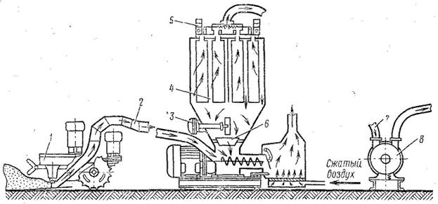 Рис. 186. Технологическая схема разгрузки цемента из крытого железнодорожного вагона цементным насосом всасывающе-нагнетательного действия: 1— заборное устройство; 2 - гибкий цементопровод; З — указатель уровня материала; 4 — фильтр осадительной камеры; 5 — электромагнит; 6—. отбойник; 7. — воздухопровод; 8 — вакуум-насос или ротациооная газодувка