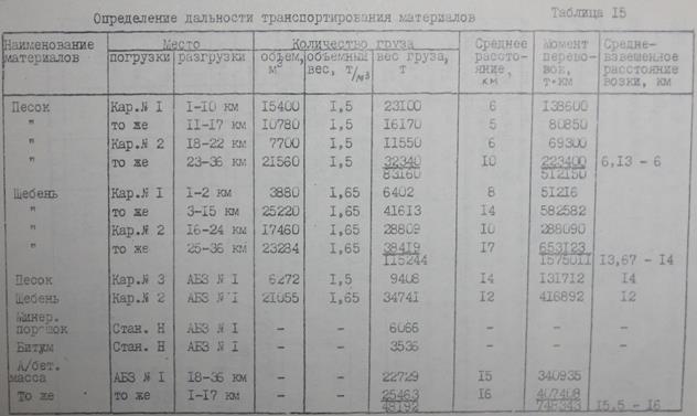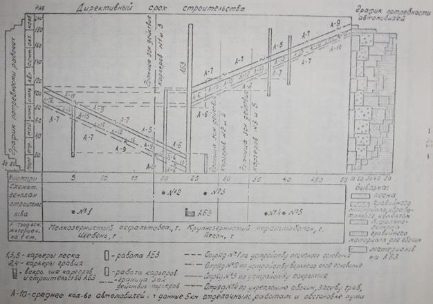 где Кп - коэффициент использования парка, принимаемый равным 0,75. Особенность поточной организации дорожно-строительных работ в том, что каждый специализированный отряд, по дороге в течение всего сезона ритмично, с одной и той же производительностью, с одинаковой потребностью в строительных материалах, находится то ближе, то дальше от источников материалов и полуфабрикатов. В связи с этим, непрерывно меняется объем перевозок, исчисляемый в тонно-киллометрах. Положение осложняется и тем, что на строительстве автомобильной дороги одновременно работает много подразделений потребляющих материалы, получаемые из различных источников.