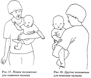 В течение дня можно понемногу начать использовать новое положение (рис 15). Это слегка видоизмененное положение "лодыжки скрещены, колено к небу". Теперь ребенок должен сидеть выше, на что-нибудь опираясь, например, на маленький картонный ящик или поролоновый куб. Он может опираться на вытянутую или согнутую руку, однако помните о "скручивании" — плечо должно быть повернуто к противоположному бедру. Сейчас опускать малыша можно в положении, показанном на рис. 16. Когда ребенок учится сидеть, советуем держать его ножки скрепленными с помощью повязок, как указывалось ранее, чтобы для сохранения равновесия он мог использовать мышцы туловища и не привыкал держать ножки широко расставленными. Когда вы сажаете малыша к себе на колени, предпочтительно, чтобы его лодыжки были скрещены, как описывалось в параграфах ОМ.А. 12, 20 и 21. Теперь самое время ввести два новых способа ношения ребенка. Держите его, как было показано в параграфе ОМ. А.8, но при этом согните его внешнюю ножку (рис. 18). Для подготовки к ползанию важно отделить ножки друг от друга. Помните о "скручивании", относящемся к плечу и бедру. Другое положение: когда вы держите малыша лицом к себе, он "сидит" на одном вашем предплечье, а другая ваша рука поддерживает его чуть ниже спинки (рис. 18).