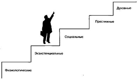 Рис. 24. Удовлетворенные и неудовлетворенные потребности И еще одна особенность, важная для объяснения человеческой личности: высшие потребности вносят больший вклад в формирование личности, нежели низшие. Можно выразиться еще определеннее: там, где начинаются высшие потребности, там, собственно говоря, начинается личность. С другой стороны, чем выше уровень иерархии, тем значительнее вклад самого человека в формирование потребностей. Это и понятно, ведь потребности расположены от неконтролируемых вверх к контролируемым. В результате возникает двунаправленный процесс: потребности движут человеком, а он формирует их содержание. В иерархии Маслоу потребности возвышаются одна над другой, и по мере своего взросления человек шагает по ним, как по ступенькам. Иначе говоря, потребности следуют друг за другом филогенетически (рис. 25). Чем выше запросы личности, тем сложнее процесс формирования потребностей. Современная молодежь, имеющая более высокий уровень образования, чаще разочаровывается в труде, если ей предоставляют путаную, однообразную работу. Ведь чем выше образование, тем выше притязания. И как следствие — более затяжной период выбора профессии по своему характеру, складу ума, запросам. Все чаще молодые люди связывают с выбором профессии выбор фундаментальных ценностей, ищут в нем ответ на главные вопросы жизни. Все потребности функционируют циклически. Например, в начале своей карьеры человек довольствуется малым: невысоким заработком, равным статусом с другими, однако по мере служебного роста претензии возрастают. Маслоу утверждал, что когда потребности удовлетворяются, они перестают служить побудительным мотивом. Однако при этом низшие и высшие потребности ведут себя по-разному. Когда низшие удовлетворены, их значение падает и они уступают дорогу высшим. А когда удовлетворены