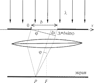Результирующее возмущение в точке P определится как сумма этих возмущений, т.е. интегралом по всей ширине щели b: