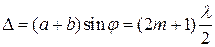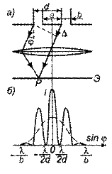 Рассмотрим дифракцию от двух параллельных щелей одинаковой ширины b и расположенных на расстоянии a друг от друга. Дифракционная картина наблюдается в фокальной плоскости линзы (рис.5.4 (а)). Положение дифракционных максимумов и минимумов от одной щели не зависит от ее положения, а определяется направлением дифрагированных лучей. Это значит, что перемещение щели параллельно самой себе не приводит к изменению дифракционной картины. Следовательно, картины, создаваемые каждой щелью в отдельности будут совершенно одинаковыми.