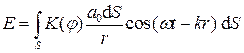где a 0 – величина, определяемая амплитудой световой волны в месте нахождения элемента d S, k – модуль волнового вектора, то есть волновое число ( Результирующее колебание в т. Р может быть представлено как суперпозиция колебаний d E от всех элементов d S поверхности S: