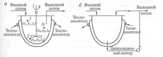 Схемы реакторов идеального смешения с механическим перемешивающим устройством (а) и циркуляционным контуром (б)