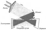 25. Голография. В обычной фотогр на фотопластинке фиксируется только часть информации о световом поле, а именно пространственное распр инт-ти света. Информация о простр.распр.фазы поля теряется. Чтобы сохранить информацию об ампл. и о фазе: способ записи волновых полей - голография. Заключается в том, чтобы фотографировать не само световое поле, идущее от объекта, а картину инт-ии этого поля с когерентной опорной волной. Картина инт-ии предметной и опорной волн, записанная на фотопластинку, называется голограммой. Т.к вид инт. картины зависит не только от ампл., но и от фаз инт-щих полей, на голограмме оказывается записанной вся информация о предметной волне — и ампл, и фаза поля. Для восст.предметной волны достаточно просветить голограмму опорной. Для получения голограммы когерентный лазерный пучок делится на 2 части. Один пучок ("сигнальный") освещает объект, а другой пучок ("опорный") падает непосредственно на фотопластинку. Свет, отраженный объектом, образует "объектный" пучок, который также направляется на фотопластинку, где инт-т с опорной волной. Картина интерференции записывается на фотопластинку и после проявления образует голограмму.