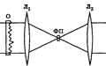 Схема Аббе-Портера. Плоская волна падает нормально на объект, нах.на расст. а от соб.линзы с фок.расст.f. Экран для наблюд. установлен в плоскости, сопряженной с плоскостью объекта, т.е. на расстоянии b, удовлетворяющем формуле тонкой линзы. На экране изобр. переверн. увел. в b/a раз.Введем функцию пропускания объекта τ(x,y)=A(x,y)/А0(х,у), А(х, у)- компл.ампл. поля сразу после прохождения объекта, А0(х, у)- ампл. поля пад.волны в пл-ти объекта. Положим А0(х, у) ≡1, a=b=2f и будем считать, что объект.симм.отн поворота на 180º. Распр.амплитуды изображения на экране Aизобр(x,y)= A(x,у)= τ(x,y). После прохождения объекта формируется простр-ный фурье-спектр (анализ) функции (след. из приближ Фраунг.) пропускания объекта по пространств. частотам kx и ky: