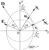 Вводим ед.векторы: n=k/|k| - нормаль к фронту волны; s=S/|S| - лучевой вектор (напр распр энергии). М/у векторами n и s - угол α, как и м/у D и E. v - фазовая скорость, ↑↑ n, указывающим напр распр пов-ти постоянной фазы (фронта волны). u - лучевая скорость, ↑↑ s, указывающим напр распр энергии волны. В эксперименте наблюдаются именно лучи. Связь: |u|=|v|/cosα= |v|/(n*s), u≥v.