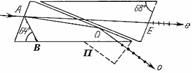 2) Двухлучевая поляризационная призма. Комбинация стеклянной призмы и призмы из исландского шпата. Необыкновенный луч проходит комбинацию призм без преломления, а обыкновенный сильно отклоняется к основанию в результате двукратного отражения на её гранях. Точки это оптическая ось
