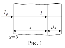 Электромагнитная волна при прохождении через среду ослабляется вследствие поглощения и рассеяния. Поглощение света - это явление уменьшения энергии световой волны при ее распространении в веществе, происходящее вследствие преобразования энергии волны во внутреннюю энергию вещества. Поглощение света может вызывать нагревание вещества, возбуждение и ионизацию атомов или молекул, фотохимические реакции и другие процессы в веществе. Рассеяние света - явление преобразования света веществом, сопровождающееся изменением направления распространения света и проявляющееся как несобственное свечение вещества, обусловленное вынужденными колебаниями электронов в атомах рассеивающей среды под действием падающего света. Оно происходит в оптически неоднородной среде, показатель преломления которой изменяется скачками от точки к точке среды вследствие флуктуаций плотности среды (молекулярное рассеяние), либо за счет присутствия в среде инородных малых частиц (мутная среда - дым, туман, эмульсии и др.). Рассеяние света в мутных средах на частицах, размеры которых малы по сравнению с длиной волны, называется явлением Тиндаля. Теория молекулярного рассеяния разреженными газами была развита польским физиком М. Смолуховским; а жидкостями - А. Эйнштейном. Закон ослабления света был экспериментально установлен французским ученым П. Бугером и впоследствии теоретически выведен немецким ученым И.Ламбертом. Пусть пучок параллельных лучей, начальная интенсивность которых при х =0 равна I0 распространяются в поглощающей среде (рис. 1).