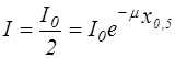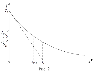 Таким образом, коэффициент ослабления численно равен обратной величине толщины слоя вещества, по прохождении которого интенсивность света уменьшается в " е " раз (е = 2,7182.. - основание натуральных логарифмов). На рис.2 показано также, что На рис. 2 (в логарифмических координатах) отмечена еще так называемая толщина слоя половинного ослабления х0,5, определяемая из условия:
