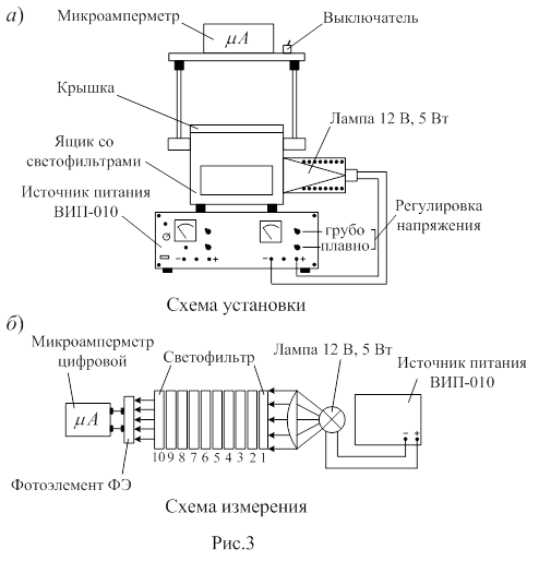 Экспериментальная установка, представленная на рис.3а, состоит из лампы накаливания мощностью 5 Вт, питаемой стабилизированным напряжением 0 - 12 В от источника питания ВИП-О10. Свет проходит через конденсорную линзу и попадает на дымчатые светофильтры (10 шт.). Bсe 10 светофильтров совершенно одинаковы, имеют толщину 7 мм каждый, и закреплены так, чтобы их легко можно было вынимать и помещать на пути лучей, падающих на фотоэлемент "ФЭ". Ток, вырабатываемый фотоэлементом, измеряется цифровым микроамперметром с ценой деления 10-8 А. Это значит, что, например, показание прибора I0 = 5000 нужно рассматривать как i = 50 мкА. Так как сила тока через фотоэлемент пропорциональна интенсивности света и конечным интересующим нас результатом эксперимента является натуральный логарифм относительной интенсивности, поэтому, с целью удобства расчетов, будем снимать четырехзначные значения со шкалы прибора и принимать их за ус