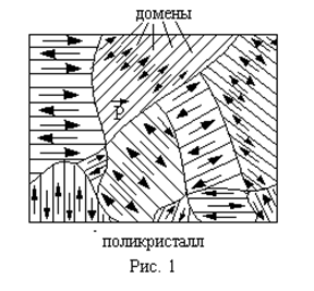 Структура ферромагнетиков и природа ферромагнетизмаИзучение этих вопросов связано со значительными трудностями, так как природа ферромагнетизма не раскрывается классической физикой, а объясняется только квантовой физикой, с которой студенты на этапе выполнения работы не знакомы. Поэтому при изучении литературы [1, с.169-173; 2, с.245-250; 3, с. 229-242] студентам рекомендуется особое внимание обратить на следующие основные положения. 1. Ферромагнетиками называются кристаллические вещества, состоящие из макроскопических, но небольших по объему (10-6-10-3мм-3) областей спонтанной намагниченности - доменов. В пределах своих границ каждый домен намагничен однородно и до насыщения. В любом кристаллике поликристаллического ферромагнитного образца (рис.1) магнитная индукция соседних доменов ориентируется по одной из «осей легкого намагничивания» кристаллика во взаимно противоположных направлениях.