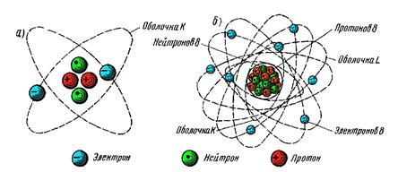 Электронной теорией строения атома вещества установлено, что все вещества, как простые, так и сложные, состоят из молекул, а молекулы из атомов. Наименьшая частица вещества, которая сохраняет его свойства, называется молекулой. Молекула — это химическая комбинация двух или более атомов. Атом — это наименьшая частица элемента, которая сохраняет химические характеристики элемента. Химический элемент — составная часть вещества, построенная из одинаковых атомов. Простые вещества — медь, алюминий, цинк, свинец и др. — состоят из одинаковых атомов данного вещества. Молекулы сложных веществ состоят из нескольких атомов различных химических элементов. Например, поваренная соль (хлористый натрий) состоит из атомов хлора и атомов натрия. Молекулы воды содержат атомы водорода и атомы кислорода. Атом состоит из протонов, нейтронов и электронов. Протоны и нейтроны сгруппированы в центре атома и образуют ядро. Протоны заряжены положительно, нейтроны заряда не имеют. Электроны расположены и вращаются на оболочках на различных расстояниях от ядра. Атомы различных элементов отличаются друг от друга. Поскольку существует свыше 100 различных элементов, то существует и свыше 100 различных атомов. Самым простым атомом является атом водорода: он имеет только один электрон, расположенный на первой электронной оболочке. Атом гелия (рис. 2, а) имеет два электрона, расположенных на первой оболочке (К), атом кислорода (рис. 2, б) — два на первой и шесть на второй (всего восемь, расположенных на оболочках К и L).