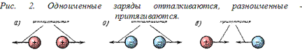 валентный электрон. Таким образом, потен-циальная возможность атома терять увеличивается. Именно валентными электронами определяется способность атомов данного элемента вступать в химические связи друг с другом и с атомами других элементов, а также электропроводность различных материалов. Физическая природа электричества. Многие электрические явления объясняются на основе электронной теории строения атома. Согласно этой теории, если электроны валентной оболочки получат достаточно энергии от внешних сил, то они могут покинуть атом и стать свободными электронами, произвольно перемещаясь от атома к атому. В этом случае они перестают быть нейтральными. Атомы, потерявшие часть своих электронов, становятся положительно заряженными ионами. Атомы, получившие избыточные электроны, становятся отрицательно заряженными ионами. Если в каком-либо теле накопятся электроны или ионы, то говорят, что в теле накопилось электричество. Такое тело становится электрически заряженным и приобретает электрические свойства. Эти свойства есть по сути дела проявление электрических сил, действующих между электронами и ядрами атомов. Электрические заряды. Количество электричества, содержащееся в заряженном теле, называется электрическим зарядом. Заряды бывают двух знаков: положительные (обозначаются знаком «+») и отрицательные (обозначаются знаком «—»). В Международной системе единиц СИ электрические заряды, т. е. количество электричества, измеряют в Кулонах (Кл). Если по проводу прошло 6,29·1018 электронов, то говорят, что по проводу прошло количество электричества, равное 1 Кл. При взаимодействии электрических зарядов (электрически заряженных тел) (рис. 2) между ними возникают электрические силы притяжения или отталкивания.