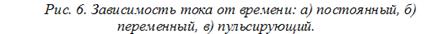 В веществе, помещенном в электрическое поле, возникает процесс направленного движения элементарных носителей электричества. Заряженными частицами являются электроны или ионы. Движение этих электрически заряженных частиц называется электрическим током. Единицей силы тока служит Ампер (А). Это такой ток, при котором через поперечное сечение проводника каждую секунду проходит количество электричества, равное 1 Кл. В формулах ток обозначают буквой I. В электротехнике широко применяют как постоянный, так и переменный ток. Постоянным называют ток, значение и направление которого в любой момент времени остаются неизменными (рис. 6, а). Токи, значение и направление которых не остаются постоянными, называют изменяющимися, или переменными.