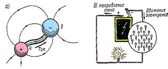 В проводнике положительные заряды движутся от положительного зажима источника электрической энергии к отрицательному. Но внутри источника эти заряды должны перемещаться от отрицательного зажима к положительному, т. е. от точки с низшим потенциалом к точке с высшим потенциалом. Такое перемещение зарядов внутри источника совершается благодаря электродвижущей силе (э. д. с.), которая возбуждается в источнике. Э. д. с. (обозначается буквой Е) поддерживает разность потенциалов на зажимах источника электрической энергии. Эта разность потенциалов определяет собой напряжение источника электрической энергии Э. д. с. и напряжение источника тесно связаны друг с другом. Если в источнике не возбуждается э. д. с., то будет отсутствовать и напряжение на его зажимах. Следует отметить, что э. д. с. и напряжение источника могут существовать независимо от наличия тока в цепи. Если электрическая цепь постоянного тока разомкнута, то ток по цепи не проходит, но при работающем генераторе или аккумуляторе в них возбуждается э. д. с. и между их зажимами действует напряжение. За единицу э. д. с., также как и напряжения, принят Вольт. В разных источниках электрической энергии э. д. с. возникает по различным физическим причинам. Например, в электрических генераторах э. д. с. получается в результате электромагнитной индукции, в химических источниках тока (аккумуляторах, гальванических элементах) — вследствие электрохимических реакций.