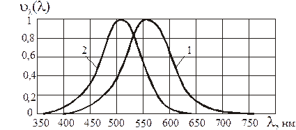 Излучение - одна из форм движения материи, сопровождающаяся переносом энергии в пространстве посредством электромагнитных волн. Шкала электромагнитных излучений охватывает диапазон от g -излучения с минимальной длиной волны l = 10-14 м, возникающего при распаде радиоактивных элементов, до длинноволнового радиоизлучения с длиной волны l = 106 м и более. Средняя область спектра электромагнитного излучения с длинами волн от 10-8 м до 10-4 м называется оптическим излучением. Оптическое излучение включает ультрафиолетовую область с длинами волн в диапазоне l = 10-8м - 0,38 ×10-6 м, видимую - l = 0, 38 ×10-6 м - 0,76×10-6 м, инфракрасную - l = 0,76×10-6 м - 10-4 м. Измерениями энергии оптического излучения в процессах его испускания, распространения и взаимодействия с веществом занимается раздел физической оптики, называемый фотометрией. В фотометрии используется две системы величин: 1) энергетическая, непосредственно характеризующая оптическое излучение как разновидность энергии, распространяющейся в пространстве; 2) эффективные, характеризующие уровень реакции приемника оптического излучения (фотоприемника). Система эффективных величин в видимой области, где в качестве приемника излучения (образцового фотоприемника) используется глаз человека, называется световой. Реакция такого фотоприемника как человеческий глаз зависит не только от энергии, приносимой светом, но также и от его спектрального состава, т. е. совокупности принимаемых монохроматических волн. Свет одной и строго постоянной частоты (длины волны) называется монохроматическим. Свет в узком диапазоне частот называется квазимонохроматическим или однородным, его глаз воспринимает как определенный цвет. Свет в широком диапазоне частот называется сложным. Белый цвет является сложным и представляет собой совокупность всех частот (или длин волн) видимого диапазона. Способность глаза человека воспринимать видимый свет различных длин волн отображается нормализованной по стандартному глазу кривой относительной спектральной чувствительности (относительной спектральной световой эффективности) глаза - кривой видности u (l) (рис. 1). Абсциссами этой кривой служат длины волн l видимого диапазона, а ординатами – относительные чувствительности человеческого глаза u l (l) на каждой длине волны. На рис. 1 представлены две кривые видности u l (l) - для дневного зрения (1) и для сумеречного зрения (2). Для дневного зрения кривая видности отлична от нуля в области от l = 380 нм до l = 760 нм (1 нм = 10-9 м), а максимум кривой видности находится на длине волны l = 555 нм и условно принимается за единицу.