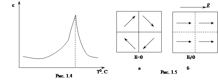 равная Dr, называется остаточным смещением. Для снятия остаточного смещения к сегнетоэлектрику необходимо приложить электрическое поле противоположного направления с напряженностью -Ес. Величину Ес принято называть коэрцитивным полем. Если максимальное значение напряженности поля таково, что спонтанная поляризация достигает насыщения, то получается петля гистерезиса, называемая петлей предельного цикла (сплошная кривая на рис. 1.3). Если же при максимальной напряженности поля насыщение не достигается, то получается так называемая петля частного цикла, лежащая внутри предельного цикла (пунктирная кривая на рис. 1.3). Частных циклов переполяризации может существовать бесконечное множество, но при этом максимальные значения смещения D частных циклов всегда лежат на основной кривой поляризации 0А. 4. Сегнетоэлектрические свойства сильно зависят от температуры. Для каждого сегнетоэлектрика существует такая температура Тс, выше которой его сегнетоэлектрические свойства исчезают, и он превращается в обычный диэлектрик. Температура Тс называется точкой Кюри. Для титаната бария BaTiO3 точка Кюри равна 1200С. Некоторые сегнетоэлектрики имеют две точки Кюри (верхнюю и нижнюю) и ведут себя как сегнетоэлектрики лишь в температурном интервале между этими точками Кюри. К числу таковых относится сегнетова соль, для которой точки Кюри равны –180С и +240С. На рис. 1.4 приведен график температурной зависимости диэлектрической проницаемости монокристалла BaTiO3. Кристалл BaTiO3 в сегнетоэлектрическом состоянии анизотропен. На рис. 1.4 левая ветвь графика относится к направлению в кристалле, перпендикулярному к оси спонтанной поляризации. В достаточно большом интервале температур значения ε BaTiO3 существенно превышают значения ε обычных диэлектриков (для которых ε=1¸10). Вблизи точки Кюри наблюдается значительное возрастание ε (аномалия). Все характерные свойства сегнетоэлектриков связаны с существованием у них спонтанной (самопроизвольной) поляризации. Спонтанная поляризация есть следствие собственной асимметрии элементарной ячейки кристалла, приводящей к появлению у нее дипольного электрического момента. В результате взаимодействия между отдельными поляризованными ячейками они располагаются так, что их электрические моменты ориентированы параллельно друг другу. Ориентация электрических моментов многих ячеек в одном направлении приводит к образованию областей спонтанной поляризации, называемых доменами. Очевидно, что каждый домен поляризован до насыщения. Линейные размеры доменов не В отсутствие внешнего электрического поля поляризованность всех доменов различна по направлению, поэтому в целом кристалл оказывается неполяризованным. Это показано на рис. 1.5, где схематически изображены домены образца, стрелками показаны направления спонтанной поляризации различных доменов. Под влиянием внешнего электрического поля в многодоменном кристалле происходит переориентация спонтанной поляризации. Этот процесс осуществляется: а) смещением доменных стенок (домены, поляризованность которых составляет острый угол Ө с внешним полем, растут за счет доменов, у которых б) поворотом электрических моментов доменов в направлении поля; в) образованием и прорастанием зародышей новых доменов, электрические моменты которых направлены по полю. Пер