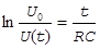 Воспользовавшись данными таблицы 6.2, построить логарифмическую зависимость, характеризующую изменение напряжения на конденсаторе от времени t при разряде конденсатора, учитывая, что U0=Y(0), U(t)=Y(X), X=t. Котангенс угла наклона полученной прямой есть характеристическое время релаксации заряда, или постоянная времени RC: