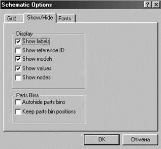 Элементы должны быть размещены на поле моделирования без наложения друг на друга как относительно условных графических изображений, так и их контактов. Кроме элементов и проводников в моделируемую схему должна быть включена точка привязки (отсчета). Функцию этой точки выполняет элемент Ground (GND). Он должен присутствовать в любой моделируемой схеме и быть подключенным. Элементы, не включенные в схему, желательно удалить во избежание ошибок моделирования. Масштабирование изображения осуществляется при нажатии на соответствующие пиктограммы (+, -) в строке меню или при использовании контекстного меню (нажатие правой клавиши мыши в свободном месте поля моделирования). При этом используются пункты Zoom In, Zoom Out. Изменение пространственной ориентации компонентов схемы (повороты), задание параметров и другие манипуляции осуществляются путем использования контекстного меню или соответствующих пиктограмм. Двойной щелчок левой клавиши мыши на контуре элемента непосредственно вызывает пункт подменю Properties (свойства). Численные значения параметров задаются в соответствии с предварительными расчетными данными. Для пассивных элементов (резисторы, конденсаторы, индуктивности) задается Value (величина) сопротивления, емкости и индуктивности. Для активных элементов, начиная с диодов, выбираются их модели из представленных списков библиотек. Удаление элементов осуществляется путем использования контекстного меню. Выделенный элемент (красный цвет контура) также удаляется при нажатии клавиши Delete на клавиатуре. Возможны групповые операции перемещения, удаления и копирования при условии предварительно созданного окна для названных действий. Прямоугольное окно создается с помощью мыши при удерживании левой клавиши. Элементы, попавшие в окно, выделяются красный цветом контуров. Дополнительные параметры для моделируемой схемы могут быть заданы при использовании пункта контекстного меню Schematic Options или при использовании основного меню Circuit (тот же пункт подменю). Внешний вид окна Schematic Options приведен на рис. 1.2. Использование пункта Grid позволяет установить сетку поля моделирования. Пункт Fonts позволяет выбрать шрифты для надписей. Активизация пункта меню Show/Hide позволяет вывести на экран или скрыть позиционные обозначения элементов, вводимые пользователем (labeles); позиционные обозначения, присваиваемые системой автоматически (reference ID); наименования используемых моделей элементов (models); значения параметров пассивных элементов (values); номера узлов схемы (nodes). Electronics Workbench позволяет использовать элементы с иерархией (вложенные). Такие элементы создаются в виде подсхем из участков схем с элементами и электрическими связями, чем обеспечивается компактная графическая форма моделируемого электронного устройства. Подсхема (иерархический элемент) создается путем включения в прямоугольное окно требуемого участка исходной схемы. Границы окна должны пересекать электрические цепи схемы, которые должны стать входами и выходами (выводами) создаваемого иерархического элемента. Обработка выделенного окна командой Create Subcircuit меню Circuit трансформирует пересечения цепей в контакты иерархического элемента и помещает его в библиотеку