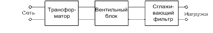 Полупроводниковые выпрямители находят широкое применение в различных областях промышленности: на железнодорожном транспорте, судах, самолетах. Они используются для питания процессов электролиза в цветной и химической промышленности; для питания системы электропривода постоянного тока различного назначения и мощности; для возбуждения крупных электрических генераторов; для питания радиотехнических устройств. Производство и распределение электрической энергии в основном осуществляется на переменном токе. В то же время около 25% всей вырабатываемой электроэнергии потребляется в виде постоянного тока. Это обусловлено тем, что часть потребителей может работать только на постоянном токе, другая часть потребителей имеет на постоянном токе лучшие характеристики и параметры. Для преобразования переменного тока в постоянный наиболее часто используют полупроводниковые преобразователи электрической энергии – выпрямители. Основными элементами выпрямителя являются (рис.2.6): - трансформатор, преобразующий величину получаемого из сети переменного напряжения в соответствии с необходимой величиной напряжения на выходе выпрямителя; - вентильная группа, преобразующая переменный ток в постоянный; - сглаживающий фильтр, необходимый для сглаживания пульсаций выпрямленного напряжения.