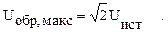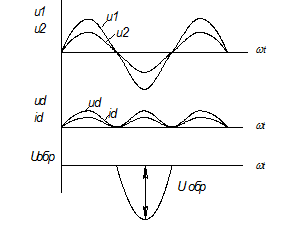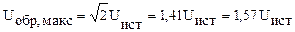 Выпрямленное напряжение при чисто активной нагрузке является пульсирующим. Коэффициент пульсации, равный отношению амплитуды импульсов выпрямленного напряжения основной частоты к среднему значению выпрямленного напряжения в этой схеме составляет 1,57. Если между анодом и катодом диода приложено обратное напряжение (“–” на аноде, “+” на катоде), то диод не проводит ток, напряжение на нагрузке равно нулю. Максимальное значение обратного напряжения между анодом и катодом диода равно амплитуде напряжения источника питания