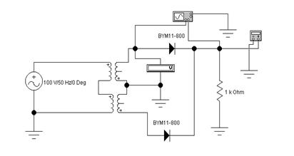 Кроме перечисленных основных элементов выпрямитель может иметь устройства для стабилизации выпрямленного напряжения и устройство для регулирования выпрямленного напряжения. По числу фаз первичной обмотки трансформатора различают выпрямители однофазного и трехфазного тока. Основные схемы выпрямителей однофазного тока: однополупериодная, двухполупериодная с нулевым выводом трансформатора, мостовая. Диоды выпрямителя и его трансформатор выбирают по основным параметрам, к которым относятся: - выпрямленное напряжение Ud и ток Id в нагрузке, определяемые требованиями потребителя; - эффективные значения токов I1, I2 и ЭДС Е1, Е2 первичной и вторичной обмоток трансформатора и его типовая мощность ST, определяемые при расчете; - максимальное обратное напряжение на диоде Uобр,макс и средний или постоянный выпрямленный ток Iпр,ср,макс текущий через прямосмещенный диод (анод положителен по отношению к катоду). Далее рассматриваются схемы выпрямителей в конфигурации, применимой для моделирования в EWB. Осциллограф, включенный в схемы, позволяет оценить форму и амплитуду выходного напряжения выпрямителя. Однополупериодная схема