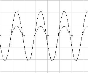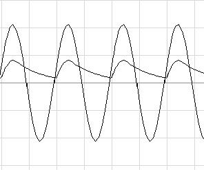Рассчитайте величину напряжения Ud. Измерьте вольтметром в режиме DC напряжение на выходе схемы выпрямителя при отключенной нагрузке. Сравните расчетное значение Ud с измеренным. С помощью осциллографа и графопостроителя оцените форму и амплитуду входного и выходного напряжения выпрямителя. Для удобства считывания временных меток окно графопостроителя растяните по горизонтали. Временные диаграммы зарисуйте или скопируйте окно графопостроителя в буфер обмена с целью его помещения, например, в документ Word. Измерьте амплитуду пульсаций и их период с помощью осциллографа или графопостроителя. Подключите параллельно нагрузке конденсатор и для разных значений сопротивления нагрузки и емкости конденсатора. Получите временные диаграммы, примеры которых показаны на рис.2.13.