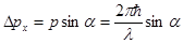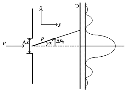 Рис.1.1. Определение положения электрона с помощью экрана со щелью Соотношения неопределенностей Гейзенберга играют существенную роль в проблеме измерений в квантовой физике. Они устанавливают принципиальный предел точности измерений, который невозможно превзойти совершенствованием приборов и методов измерений. Любая попытка измерить, например, координату частицы приводит к искажению первоначального состояния частицы за счет взаимодействия ее с измерительным прибором, в результате чего появляется неопределенность в значении импульса. Простейшим экспериментальным прибором, позволяющим определить положение электрона, может служить узкая щель или отверстие, расположенные перпендикулярно направлению движения электрона (рис. 1.1). Направим ось x параллельно плоскости щели, а ось y - перпендикулярно к ней, как это показано на рисунке. Пусть импульс электрона до прохождения щели будет равен p, причем неопределенность x -составляющей импульса