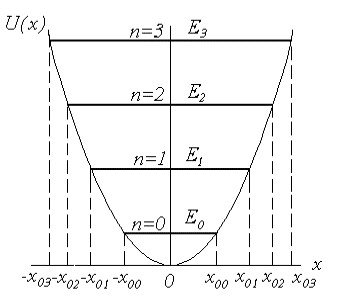 Энергетические уровни квантового гармонического осциллятора эквидистантны, т.е. находятся на равных расстояниях друг от друга (рис. 1.5). На этом рисунке через ± x0n обозначены точки поворота классического осциллятора с такой же энергией En, как и у квантового осциллятора.