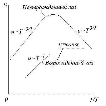 Таким образом, концентрация носителей заряда в собственных полупроводниках зависит от ширины запрещенной зоны Eg и температуры Т. Для германия, например, Eg = 0,72 эВ (при T = 300 K) и концентрация собственных носителей заряда при комнатной температуре составляет приблизительно 2,51019 м-3. Для кремния соответственно Eg = 1,1 эВ и ni = 1,5 1016 м-3. Другим фактором, влияющим на температурную зависимость электросопротивления собственных полупроводников, является подвижность носителей заряда. Температурная зависимость подвижности носителей заряда в полупроводниках определяется механизмами рассеяния носителей в кристалле. В идеальном полупроводнике с собственной проводимостью подвижность определяется рассеянием на тепловых колебаниях решетки (фононах), поскольку идеальный собственный полупроводник - это полупроводник без примесных атомов и рассеяние на примесных атомах отсутствует. При анализе температурной зависимости подвижности необходимо учитывать, является ли газ носителей невырожденным или вырожденным при данных условиях. Теоретические расчеты и оценки температурной зависимости подвижности носителей заряда в кристаллах при различных условиях схематически представлены на рис. 4.5. В области высоких температур подвижность обратно пропорциональна Т3/2 для невырожденного газа носителей и обратно пропорциональна Т для вырожденного газа носителей. В области низких температур подвижность невырожденного газа носителей пропорциональна Т3/2 и не зависит от температуры для вырожденного газа носителей. В любом случае степенная зависимость от температуры подвижности носителей значительно слабее экспоненциальной температурной зависимости концентрации носителей заряда в собственных полупроводниках. Вследствие этого температурную зависимость удельной электропроводности собственных полупроводников согласно выражению (4.15) в первом приближении можно представить в виде