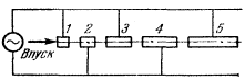 Заряд переносится лентой к кисточкам 3, соединенным с большим металлическим шаром 4, находящимся на изо-лирующей колонне 5. Попадая на внутреннюю поверхность шара, заряд немедленно переходит на внешнюю, так что внутренняя поверхность все время остается незаряженной. Таким путем удается поднять потенциал шара до нескольких миллионов вольт. Поле у поверхности Е == q/(E)R2 не должно превышать напряженности пробоя диэлектрика, в котором находится шар (для воздуха ~30 000 в/см). Есть и другие технические причины, ограничивающие потенциал генератора, например разряды вдоль вакуумной ускорительной трубки (ем. ниже). Потенциал шара ф = q/(E)R = ER, так что при заданной напряженности потенциал тем больше, чем больше радиус шара (последний в реальных генераторах достигает нескольких метров). Пробивное напряжение можно значительно увеличить, помещая шар в жидкий диэлектрик, находящийся под давлением. От внешней поверхности шара идет вакуумная трубка, в которой движутся ускоряемые частицы. Второй электрод трубки соединяется с землей или с другим генератором, имеющим противоположный знак заряда. Преимущество электростатического генератора - в его простоте и стабильности работы. Однако по величине напряжения он не идет в сравнение с современными ускорителями. Большинство современных ускорителей заряженных частиц (электронов, ионов, атомных ядер)- циклические. Траектория частиц в этих ускорителях - спираль или окружность. Такая траектория достигается с помощью магнитного или вихревого электрического поля или обоих полей вместе. Линейные ускорители выгодно отличаются от циклических весьма малым излучением движущихся зарядов, простотой впуска и выпуска частиц. Современные линейные ускорители работают не от электростатического генератора, а от генератора переменного напряжения (резонансные линейные ускорители). Схема резонансного ускорителя приведена на рис. 25. Внутри каждой трубки потенциал постоянен, соответственно этому постоянна и скорость частиц. Длины трубок увеличиваются так, чтобы время прохождения частицей каждой трубки (с учетом изменения массы со скоростью, т. е. эффектов теории относительности) равнялось половине периода генератора. Отрицательно заряженная частица должна подойти к зазору между трубками 2 и 3 в тот момент, когда потенциал трубки 3 положителен (а трубки 4 отрицателен). Тогда, проходя зазор 2-3, частица ускорится. За время движения частицы в трубке <3 потенциал трубки 4 должен изменить знак, для чего должна пройти половина периода, и т. д. При точном резонансе полная энергия частицы на выходе равна nu, где n -число ускоряющих трубок, u - напряжение генератора. Линейные резонансные ускорители строятся на энергии порядка 10^8-10^9 эв.