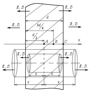 Для решения задачи применим метод Гаусса. Из условия следует, что заряд, сообщенный листу стекла извне (его принято называть свободным зарядом) распределен в пространстве симметрично относительно плоскости, проходящей через точку А перпендикулярно оси х (см. рис.1.8). Поэтому есть основание утверждать, что электрическое поле симметрично относительно этой плоскости. Кроме того, так как мы рассматриваем диэлектрик, находящийся в электрическом поле, то чтобы исключить рассмотрение влияния поляризационных зарядов диэлектрика, теорему Гаусса следует применять для вектора электрического смещения . Полагая, что точки А,В,С достаточно удалены от краев листа стекла, можно считать, что линии вектора в любой точке расположены параллельно оси х. Исходя из этого, будем выбирать гауссову поверхность в виде цилиндра, образующие которого параллельны оси х, а основания перпендикулярны к ней и расположены от плоскости симметрии на равном расстоянии.