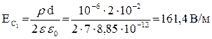 модуля вектора напряженности от координаты х (рис.1.9). Отметим, что при переходе из стекла в воздух модуль напряженности скачком увеличивается в e раз. Найдем теперь численные значения напряженности Е в точках А,В,С (рис.1.9). 1. Точка А: х = 0; ЕА = 0. 2. Точка В: х = d/4; 3. Точка С: х = d/2; ЕС имеет два значения: а) внутри стекла б) вне стекла