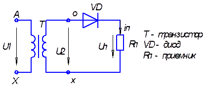 Первичная обмотка трансформатора подсоединена к синусоидальному току. Трансформатор является масштабным преобразователем напряжения, и меняет его только по амплитуде, а по форме остается постоянным в каждый положительный полупериод напряжения на вторичной обмотке. Диод включается в прямом направлении и беспрепятственно пропускает ток, падение напряжения на нем равно 0, пожтому напряжение на приемнике повторяет и по форме и по амплитуде напряжение U2, в отрицательном полупериоде диод закрыт, ток в приемнике равен 0 и напряжение на его зажимах тоже равно 0. Принцип действия удобно показывать, используя временные диаграммы.