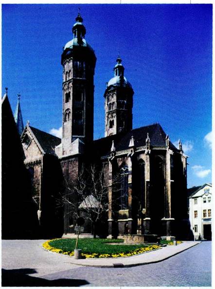 Собор в Солсбери. 1220—1258 гг. Англия. использовались криволинейные формы, сложный рисунок, ажурный орнамент. В то время почти не строили крупных соборов — заканчивали уже начатые здания. В XII—XIV вв. Германия, в которой за власть боролись между собой император, князья и высшее духовенство, оставалась раздробленной страной. В этих условиях важное значение приобрели города. Соборы и ратуши здесь стали центрами готического искусства. Широкое распространение в Германии готика получила в первой половине XIII в. Готические соборы в Германии значительно отличались от французских. Желая как можно ярче передать стремление человеческого духа к небесам, немецкие архитекторы резко увеличили высоту сводов, увенчав их башенками со шпилями. Особенно роскошно украшали западные фасады соборов с одной или двумя высокими стройными башнями. Как правило, здесь не было наружных полуарок (аркбутанов); не встречались и окна-розы, вместо них использовали стрельчатые окна. Памятниками готической архитектуры Германии являются соборы в Марбурге, Наумбурге, Фрейбурге, Ульме и других городах. Выдающееся произведение германской архитектуры — собор в Кёльне (1248 г. — XIX в.). Здание высотой сорок шесть метров, украшенное множеством арок, шпилей, ажурной резьбой, стрельчатыми окнами, и в наши дни царит над городом. Скульптура Германии, как и в романский период, в основном украшала не фасады, а внутренние помещения храмов. Произведения германской готической скульптуры по сравнению с французской менее изящно и тонко исполнены. К ранней готике относится скульптурное убранство собора в Бамберге. Здесь находятся многочисленные рельефы, а также фигура Всадника (около 1237 г.) — одна из самых загадочных статуй Средних веков. Неизвестно, кого изображает эта скульптура — императора Карла Великого, императора Отгона или просто христианского воина. Выдающимся произведением германской скульптуры являются статуи основателей собора в Наумбурге (вторая половина ХШ в.), в частности маркграфа Эккерхарда и маркграфини Уты.