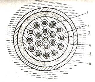 Схема гетерогенного реактора. 1 – ядерное топливо; 2 – замедлитель; 3 – теплоноситель; 4 – отражатель; 5 – корпус реактора; 6 – биологическая защита.