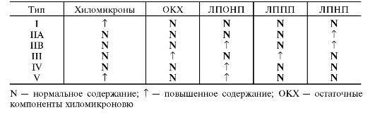 Гиперлипопротеинемии - состояния, проявляющиеся стойким повышением содержания ЛП в плазме крови. В 1967 г. Фредриксон и соавт. разработали классификацию гиперлипопротеинемий. Позднее эта классификация была пересмотрена специалистами ВОЗ (табл. 10-3). Таблица 10-3. Типы гиперлипопротеинемий и содержание различных липопротеинов при них