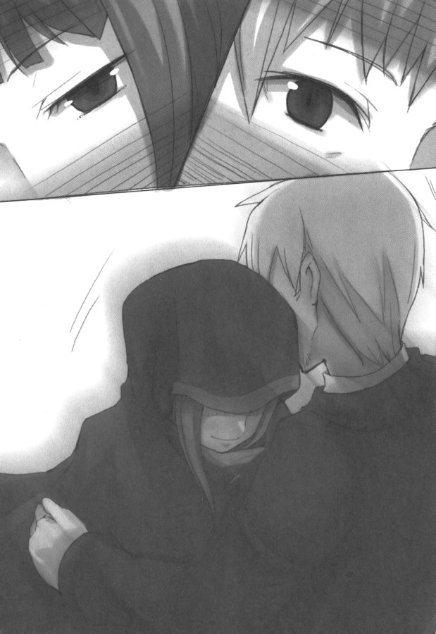 – Понятно. Ты тоже из Рувика? – Нет. Я член Торговой Гильдии Ровена. – Хмм, – и монах кивнул. Он производил настолько отталкивающее впечатление, что Лоуренс подивился даже, было ли его хмыканье ответом – может, просто складки жира на шее выдавили воздух, когда он кивнул. – Позвольте узнать, что случилось? В воздухе висело слишком ощутимое напряжение, чтобы можно было предположить, что монахи явились просто побеседовать, – особенно с учетом того, что один из них за спиной у Лоуренса грубо рылся в пожитках, одеялах и даже дровах. Возможных ответов было немного. Несомненно, Хаскинс попал под подозрение монахов. Они думали, что он наткнулся на гонца, когда разыскивал заблудившуюся овцу, и украл что-то у него. В действительности подобное случалось нередко. – Нет, ничего необычного не произошло… Ты только что сказал, что ты член Торговой Гильдии Ровена? На вопрос монаха Лоуренс мог лишь ответить честно: – Да. – Насколько мне известно, наш монастырь не ведет дел с этой гильдией. Если сейчас Лоуренс ударится в панику, позже ему не на что будет жаловаться, когда Хоро начнет его пинать в спину. – Верно, однако я здесь не по торговым делам. – О? – прищурился монах. – Я пришел сюда с этими Господними агнцами, дабы очиститься в святости монастыря Брондела. – …Так вы паломники? – Да. В монастыре Брондела давно уже не принимали паломников с гостеприимством. В нынешнее время паломнический визит сюда торговца, да еще с монахиней и мальчиком, был делом весьма необычным. Губы монаха изогнулись в улыбку, но глаза не улыбались. – Ровен… насколько я помню, эта гильдия находится на материке… Разве там нет множества знаменитых церквей и монастырей? Например, в одном только Рубинхейгене есть монастырь Святого Либера, монастырь Ла Киакка, церковь Джибротта. Его расспросы походили скорее на допрос – особенно на фоне обыска, который учинял второй монах. – До меня дошел слух, что здесь есть некая священная реликвия. – Священная реликвия, – повторил монах, не утрудив себя использованием вопросительного тона. – О да. Я слышал, ваш монастырь глубоко любим не только Господом, но также овцами. И потому он более, чем другие названные тобой места, подходит такому торговцу, как я. Монах усмехнулся на шутку Лоуренса, но отвел свой жирный взгляд, как только второй монах перешел в соседнюю комнату. Там были пожитки Лоуренса и его спутников; однако все торговцы привыкли носить опасные вещи с собой. Так что, даже если все их вещи вывалят на землю и обшарят, бояться нечего. – Понятно… судя по твоему виду, ты опытный торговец. Да благословит тебя Господь! Лоуренс кивнул, хоть и понимал, что монах иронизирует. – Марко! Молодой монах, услышав призыв толстого, тут же прекратил рыться в пожитках и выбежал из спальни, словно дрессированная собака. Он нисколько не походил на монаха, как его обычно рисует воображение, – прилежно молящегося день за днем. По правде сказать, больше всего он напоминал хорошо обученного наемника. – Ну что? – Я ничего не нашел. – Вот как? Почему толстый монах выказывал столь открытую враждебность? Просто чтобы надавить на Лоуренса, Хоро, Коула и Хаскинса? Или он, ничего не найдя, пытался спасти лицо? Как бы там ни было, судя по всему, пока что четверка была в безопасности. Так Лоуренс полагал. – Кукушка подбрасывает яйца в чужие гнезда. Обыщи этих двоих. Толстый м
