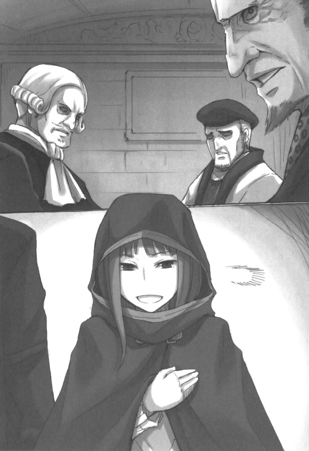 Когда они пришли на постоялый двор Альянса, Лоуренс ощутил, что там царит необычная атмосфера. Здесь все было окутано странным жаром, будто в огонь подкинули чересчур много дров. Возможно, это давал о себе знать визит монахов. Когда два надменных монаха ведут себя так бесцеремонно, всякий торговец, если только он не спит, чует запах крови, точно волк. Здешние торговцы, должно быть, понимали, что монахи ведут себя так неприлично, потому что загнаны в угол. Все собравшиеся здесь были из тех, кто готов воспользоваться слабостью монастыря или на худой конец поглазеть на неотвратимое. Вполне естественно, что в помещении, наполненном такими людьми, было очень жарко. Вот почему, когда Пиаски ввел Лоуренса и его спутников, все взгляды обратились на них. Вошли чужак-торговец, похожая на монахиню девушка и мальчик, напоминающий слугу; а привел их сюда, в логово здешних торговцев, и даже проводил вверх по лестнице не кто иной, как сам Пиаски. Разумеется, вопросы читались на каждом лице. Может, эти трое что-то обнаружили? На вошедших один за другим обращались полные зависти взгляды, будто стремясь прожечь дыры в одеждах. Не то что Хоро – даже Лоуренса эти взгляды кололи. Коул – тот вообще не осмеливался поднять голову. – Мы пришли. Пиаски остановился перед дверью в самой середине третьего этажа. Затем молодой торговец расправил одежду и постучал. – Прошу прощения за вторжение. Едва они вошли, их омыли ароматы пряностей вместе с запахами молока и меда. Такой запах всегда окружает людей, которые считают, что еда не еда, если она как следует не приправлена. Посреди комнаты стоял круглый стол, за которым сидели четверо торговцев средних лет. От них веяло чем-то таким… Лоуренс не удивился бы, окажись они владельцами крупных торговых домов. Возможно, так оно и было. Несомненно, жизнь в этом заснеженном монастыре сказалась на них. Однако то, что лишь один из них удостоил вошедших взглядом, едва ли объяснялось их усталостью. – Я, ваш покорнейший слуга Лаго Пиаски, пришел с визитом. – Оставь церемонии. У нас мало времени. Эти слова произнес приземистый мужчина, волосы которого завивались возле ушей. Свои слова он подкрепил жестом, после чего его узкие глаза повернулись к Лоуренсу. – Я слышал, ты из Ровена? – Да. – Хмм… Он просто задал вопрос, на который хотел получить ответ; он не дал Лоуренсу возможности представиться. Остальные мужчины за столом сидели неподвижно, даже к напиткам своим не притрагивались. – Позвольте нам объясниться? – промолвил Пиаски, будто противясь тяжелой атмосфере. Человек с завитыми волосами приподнял руку, давая знак начинать. – Благодарю вас за то, что уделили нам свое драгоценное время. Сначала, пожалуйста, обратите внимание вот на эти бумаги. Пиаски достал из-под мышки пачку пергаментов; стоявший возле стены слуга тотчас подошел, забрал их у него и положил на середину стола. Четверка лениво потянулась за бумагами, пробежала взглядами, и их глаза прищурились. – Копии их торговых записей, э? И что с ними не так? На этот раз говорил другой человек. Он был тощ, кожа да кости, и, казалось, всех подозревал. Он говорил таким тоном, будто уже устал от происходящего. Вокруг унылых глаз собралось множество морщинок – так много, что веки казались чешуйчатыми. Остальные трое были на вид не менее усталыми; бегло оглядев бумаги, они положили их обрат
