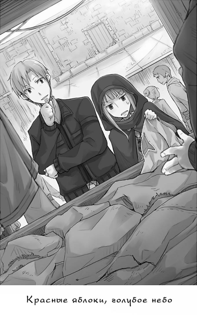 Лоуренс поднял голову, осознав внезапно, что в комнате стихло. Но теплый солнечный свет и оживленные звуки города по-прежнему вливались в комнату через открытое окно. Почему же в комнате стало тихо? Ровно свернув лист пергамента в свиток, Лоуренс глянул в сторону кровати, где сидела, ковыряясь в зубах, подозреваемая. – Так ты жевала все это время? Сколько уже съела? Девушка с русыми волосами, каким позавидовала бы любая аристократка, Хоро – так ее звали, – шевельнула своими звериными ушами и принялась отсчитывать на пальцах. – Десять. Нет, постой, семь… и те девять. – А осталось еще сколько? Ее хвост, предмет зависти любого торговца, возбужденно метался. Но лицо ее сейчас было как у собачки, которую отругал хозяин. – Восемь… восемь… – Восемь? – Восемьдесят… одно. Лоуренс вздохнул. Хоро с кислым видом уставилась на него. – Ты намекаешь, что я с ними не справлюсь? – Я и слова не сказал. – А что ты собирался сказать после того, как этак вздохнул? Помедлив чуть-чуть, он произнес: – Значит, ты уже на пределе? Эти слова он произнес, избегая ее взгляда, и отвернулся, чтобы обвязать шнурком свиток пергамента. Увы, это лишь напомнило ему, что левая рука по-прежнему его не слушается. Он получил рану в стычке несколько дней назад, хотя произошло это по его собственной вине. Однако именно благодаря той стычке он и Хоро оказались теперь связаны. И определить цену подобных связей просто невозможно. Во всяком случае, поднимаясь на ноги, он подумал, что его рана – весьма небольшая цена за эту связь. В одном из углов комнаты стояло четыре ящика с яблоками. Если верить счету, который к ним прилагался, там было всего 120 плодов. Пока что Хоро слопала 39. При всей ее любви к яблокам – все шло к тому, что они испортятся до того, как она с ними разделается. – Тебе обязательно так упрямиться? – Я не упрямлюсь. – Правда? Гигантская волчица в теле девушки, присматривавшая за пшеничными полями на протяжении многих человеческих жизней, под градом настойчивых вопросов Лоуренса отвернулась, как ребенок. Мгновением позже и уши ее поникли. – Правда… что меня от них уже воротит. Лоуренсу хватило мудрости не рассмеяться (что спасло его от гнева Хоро), и он просто согласился. – О да, даже если ты их обожаешь, рано или поздно такое должно было случиться. – И все равно. – Хмм? – Я их все съем. Эти слова она произнесла решительно, глядя на него глазами, в которых, как ни странно, не было ни следа гнева. Внезапная смена ее настроения смутила Лоуренса, но лишь на миг. Да, она купила 120 яблок на его деньги и без его разрешения. От такого количества не так-то просто отмахнуться, да и сумма была немалая; однако эту покупку она сделала не из пустого каприза. Ситуация была несколько вывернутая, но Хоро была вынуждена полагаться на деньги Лоуренса для достижения каких бы то ни было удобств во время их путешествия. Она очень устала от своей жизни в роли богини урожая и потому попросила Лоуренса отвезти ее на родину. Так началось их странствие; однако, чтобы истории этого мира продолжались, требовалось нечто большее, чем начальный толчок. Поэтому Лоуренс не сердился по поводу яблок. Вообще-то Хоро купила не только яблоки, но и кое-какую довольно роскошную одежду. И все же, хотя Лоуренс сам был не против, чтобы она это сделала, он мог посмотреть на произошедшее ее глазами: она чувствовала себя виноватой, 