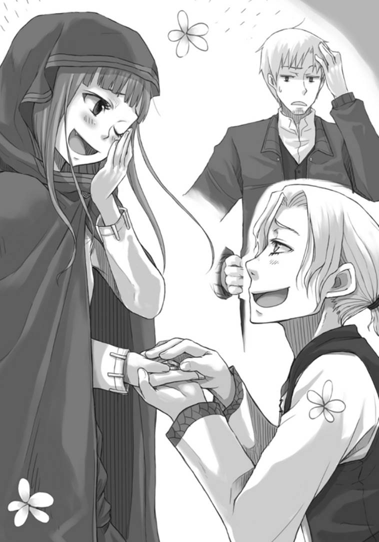 При этих словах Хоро Вайсс принял серьезное выражение лица, подобающее оруженосцу рыцаря. – Я боюсь, здесь слишком много монет для моей маленькой ручки. Не успел Лоуренс насмешливо произнести «да уж конечно, слишком много», как Вайсс уже ответил: – О госпожа Хоро, именно поэтому к твоим услугам мои руки. Хоро изобразила удивление и обеспокоенным тоном ответила: – Но так нельзя, эти драгоценные руки нужны тебе для работы. Вайсс с упрямым видом покачал головой. – Дабы не позволить монетам выпасть из твоих рук, я с радостью позволю тебе воспользоваться моими. Мне не на что жаловаться, ведь в моем сердце уже есть дыра, иформа этой дыры – точь-в-точь твоя. Господь дал мне руки как раз для того, чтобы заполнить эту дыру. Хоро отвернулась, словно робкая дева из аристократической семьи. Вайсс неотрывно смотрел на нее с совершенно искренним видом. Столь напыщенный разговор – это уже слишком. Если бы это было простое лицедейство, Лоуренс мог бы это вытерпеть, но сейчас это его просто раздражало. Наконец он произнес ледяным тоном, чтобы слегка охладить эту парочку: – Для серебра кошели, для золота сундуки. И лишь для медных монет – руки. Уж это-то ты не забыл, Вайсс? Это было первое, что Вайсс должен был выучить как меняла, ведь правильное обращение с деньгами в его деле превыше всего. Подобная фраза была самым простым способом вернуть его к реальности. И верно, он наконец выпустил руку Хоро и поскреб в затылке. – Ох, тебе бы осторожнее быть. Держать столь очаровательную девушку лишь для себя одного – оскорбление Господа. Или ты забыл, что хлебом насущным надлежит делиться с ближним? – Ты желаешь, чтобы я поделился? Лоуренс раскрыл кошель и позволил Хоро ссыпать туда монеты. Только что она улыбалась, но сейчас наблюдала за ним с бесстрастным выражением лица. – Извини, но у стола менялы в долг не дают. Только меняют… или не меняют, – произнес Лоуренс, глядя на посерьезневшего Вайсса. Тем временем последние серебряные монеты очутились в кошеле Лоуренса. – Кстати, если бы ты ее заполучил, попутно заполучил бы и ее долг передо мной. Как тебе это? – Кх… Вайсс отодвинулся, раздумывая над этим обстоятельством. Он явно жалел, что разговор снова вернулся к деньгам. Впрочем, он к этому явно был привычен; с печальным видом Вайсс повернулся к Хоро. – Я никогда не назначу цену на тебя. Хоро, расслабившаяся было, тут же возобновила свое лицедейство. – Весы моего сердца раскачиваются влево-вправо, но, поверь мне, отнюдь не под тяжестью золотых монет. – О, конечно же! Вайсс вновь потянулся своими руками и обхватил ладошку Хоро. – О… ты прикоснулся к моим качающимся весам… воистину ты мошенник. Таким вот тоном разносчица в трактире распекает пьяного посетителя. Вайсс провалился. Лоуренс вздохнул – ему было довольно. Заканчивая эту драму, он жестом пригласил Хоро. – Ладно, идем. – Э, эй! Лоуренс! – Хмм? – Раз ты пришел менять деньги, значит, ты собираешься что-то покупать, верно? – Верно. Мы собираемся на север, так что нам нужно приобрести кое-какую одежду. Глаза Вайсса по-прежнему смотрели пьяно. – Прямо сейчас? – Прямо сейчас. Хоро, наблюдая за ними, хихикнула. Она была достаточно умна, чтобы понимать скрытое значение этих слов, так что озадаченность Вайсса от нее не укрылась. – Цены поднимаются вслед за солнцем, так что чем раньше купим все, что надо, тем лучше. – Ээ… Су