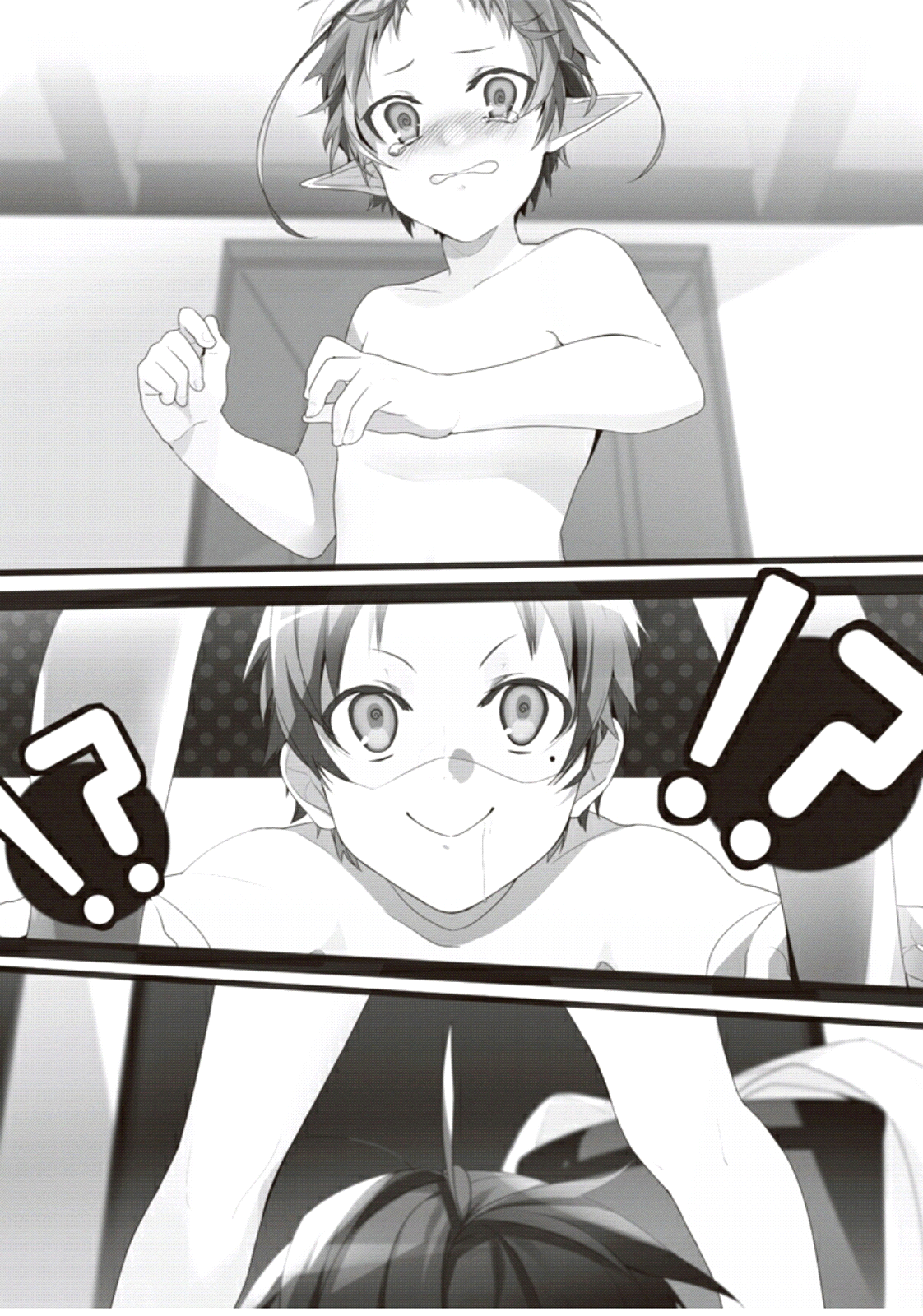 - Я вернулся. - И-извините за беспокойство... - Только войдя в ворота я увидел служанку Лилию, стоящую в дверях с большим полотенцем. - С возвращением, господин Рудэус... и ваш друг. Горячая вода уже готова. Прежде чем простынете поднимитесь на второй этаж и насухо вытритесь. Господин и мадам скоро вернуться, так что мне надо подготовить всё для них. Справитесь самостоятельно? - Без проблем. Лилия должно быть предвидела, что мы вернёмся вымокнув под ливнем. Пусть даже она немногословна, особенно со мной, она определённо очень способная горничная. Даже если я не сказал ей, она тут же достала второе полотенце, едва увидев Сильфа. Мы сняли обувь и пошли босиком, давая высохнуть ногам и волосам во время подъёма на второй этаж. Как только мы зашли в комнату я увидел большую бочку наполненную горячей водой. В этом мире ещё не придумали душ, здесь даже не было культуры бань или ванных, только использование подобного, чтобы оттереть грязь и омыть тело. Согласно Рокси, ещё вроде бы пользуются горячими источниками. Ну, для меня, кто даже душ не любит принимать, этого вполне достаточно. - Хм? Когда я разделся до гола, Сильф только суетливо мялся, краснея. - Что не так? Если ты не разденешься, ты же простудишься, так? - Эх? Ммм, мм... Но Сильф не двинулся с места. Он стесняется раздеваться в чьём-то присутствии... Или может он просто не знает, как снять одежду самостоятельно? Ничего не поделаешь, ему всего шесть... - Давай, подними руки. - Но... Эм... Я заставил Сильфа поднять руки и стянул с него рубашку. Его белоснежное тело без каких либо следов мускулов предстало передо мной. Когда я стал стягивать штаны, он схватил меня за руки. - Н-нет... Он так стесняется, что его кто-то увидит? Я был таким же в молодости. В детском саду я по-настоящему смущался под взглядами других детей своего возраста, когда переодевался после уроков плавания. Но руки Сильфа были холодными. Если это затянется он действительно схватит простуду. Я взялся порешительнее и стащил его штаны. - С... Стой... Когда я добрался до его нижнего белья, он ударил меня по голове. Сильф смотрел на меня весь в слезах, когда я поднял голову. - Я не буду над тобой смеяться... - Н-неиз-за этого... Н-нет!!! Он сопротивляется так горячо. Это первый раз, когда я видел от него такое сильное сопротивление. Я чувствовал себя слегка потрясённым. Может это что-то вроде табу, по которому эльфам нельзя показывать свою наготу? Если дело действительно в чём-то таком, это будет неправильно насильно раздевать его... - Я понял, я понял. Тогда ты должен пообещать. Тебе обязательно нужно переодеться. Мокрое бельё это очень неприятно, а если ты замёрзнешь, ты можешь даже застудить лёгкие. - Хорошо... Я убрал руки и Сильф со слезами кивнул в ответ. Он действительно милый. Я по настоящему хочу наладить хорошие отношения с этим милым ребёнком. Неожиданно я почувствовал себя обманутым. Разве это справедливо, что я тут один стою голышом?! - Попался! Одним рывком я стянул его нижнее бельё.