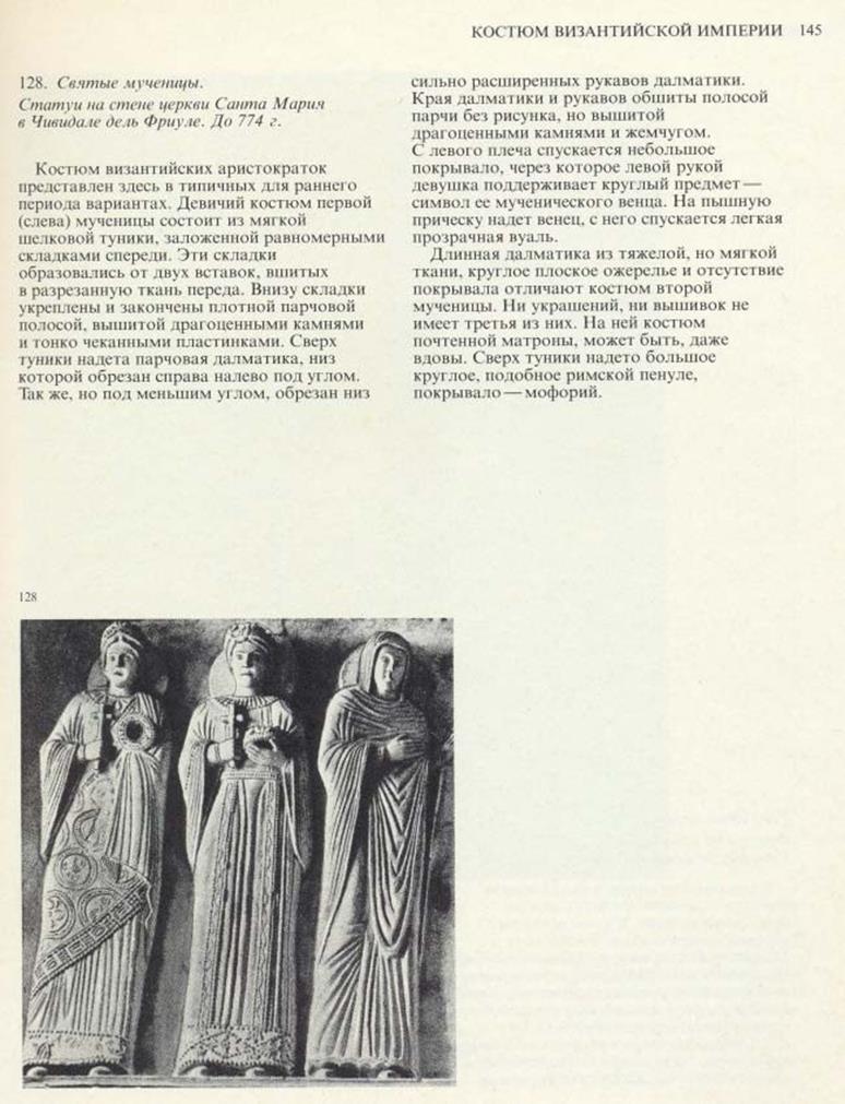 муяеіінцдх, нзсібраягеняы х на мозаи- ке в іtерхви св, Аполлянария Нового в Равеііне. Значительяо вндпизмеяешіы е, яные по пр‹іпорииям костюмы мы вядим на сяулкптурах мучеииц в цер- zвн Санта Мария делла Валле в Чи- вндале (середина Vll I веьа), tИл, 1281. ИзоБражеяне более позднего ко- стюма девушек-арнстократсік встре— чается н на мнняаз юрах. Так па платюре из ътпусгрипта «Спава