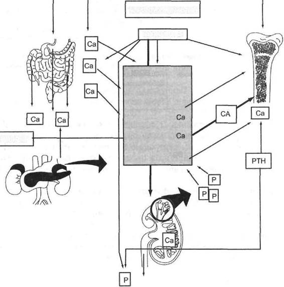 Витамин D, поступающий в организм с пищей, соединяется с а2-глобулином и поступает в печень, где под действием фермента 25-гидроксалазы превращается в биологически активный метаболит — 25-гидроксихолекальциферол (25-OH-D^), (кальцидиол). Этот метаболит поступает из печени в почки, где под влиянием фермента 1а-гидроксилазы из него синтезируется 2 метаболита: • 1,25-дигидроксихолекальциферол [l,25-(OH)2-DJ (кальцитриол), который в 5-10 раз активнее витамина D. Это быстродействующее активное соединение, играющее ключевую роль в регуляции всасывания кальция в кишечнике и доставке его к органам и тканям. Рис. 11-1. Обмен кальция в организме. • 24,25-дигидроксихолекальциферол [24,25-(OH)2-DJ, который обеспечивает фиксацию кальция и фосфатов в костной ткани, подавляет секрецию парат- гормона. Это длительнодействующее соединение, контролирующее минерализацию кости при достаточной доставке кальция к участкам её образования. Концентрация кальция в сыворотке крови является постоянной величиной и составляет 2,25-2,7 ммоль/л. В норме концентрации кальция и фосфора поддерживаются в соотношении 2:1, что необходимо для правильного формирования скелета. Кальций в крови находится в 2 формах — ионизированной и связанной с белком. Всасывание ионов кальция осуществляет эпителий тонкой кишки при участии кальций-связывающего белка, синтез которого стимулирует активный метаболит витамина D — l,25-(OH)2-D3. Он необходим наряду с гормонами щитовидной и паращитовидных желёз для нормального окостенения и роста скелета. Недостаток витамина D приводит к снижению уровня активного метаболита в сыворотке крови, что нарушает всасывание ионов кальция в кишечнике, их реабсорбцию почечными канальцами, а также снижает активность резорбции кальция и фосфора из кости, что может привести к гипокальциемии.